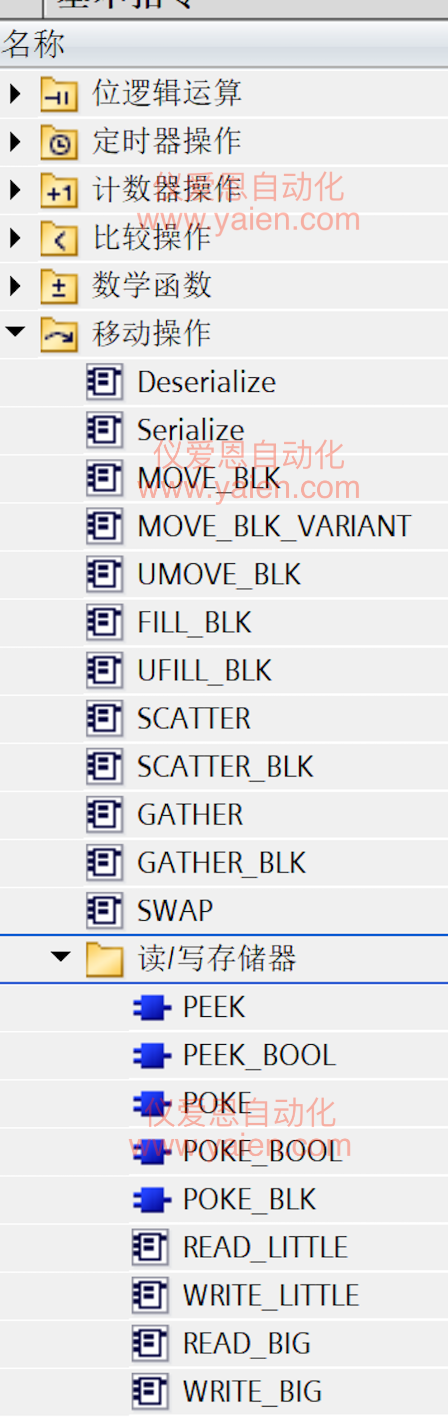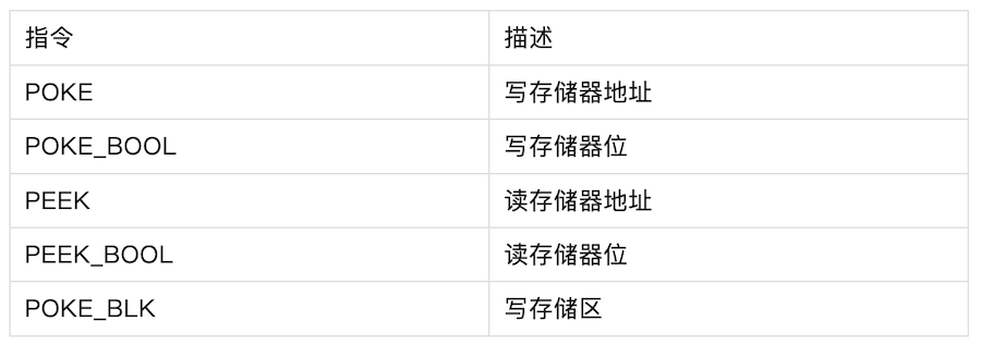 (3)间接寻址 PEEK和POKE指令,可以对I/O、M存储器和数据块的读取和写入,而通过POKE_BLK可以实现数据区域的复制或者移动适用于I、M、Q、DB、接口区变量且DB块必须为非优化块访问。